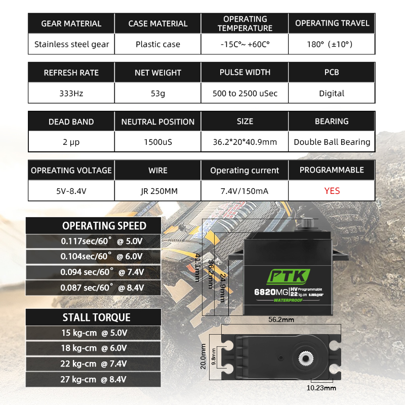 About PTK-VOTIK Huizhou Yinyi Technology Co., Ltd. was established in 2021, is a high-tech enterprise engaged in intelligent transmission company mainly R & D, production and sales of various types of servo, the main categories are: model aircraft servo, model vehicle servo, fixed wing servo, RC servo, robot arm servo, metal servo, etc. Widely used in models, toys, iot home control, micro mechanical control drive, robot field.